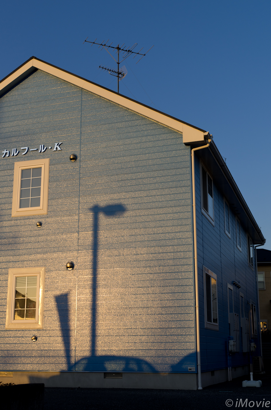 アパートの壁面、朝日を浴びて街路灯のシルエットが写ります。