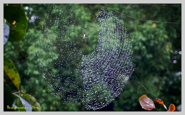 雨でクモの糸に水滴がたくさんついていました。