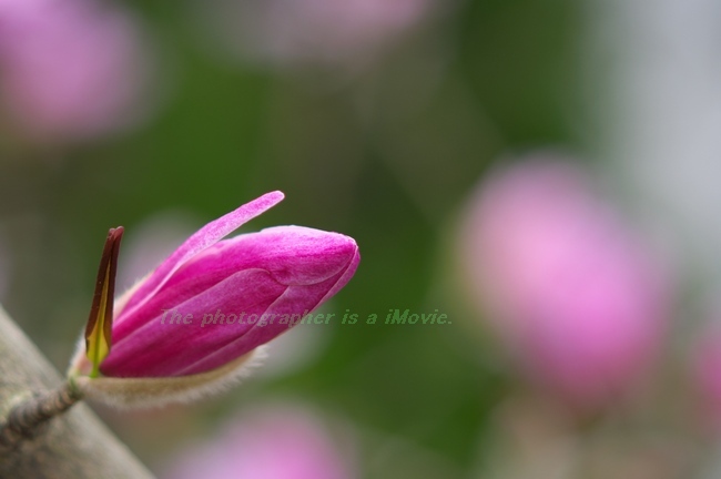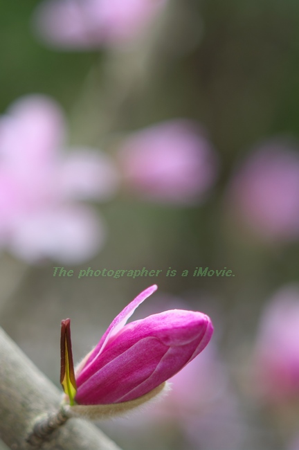 ヒメコブシの蕾の背景で、花が咲きほこっています。