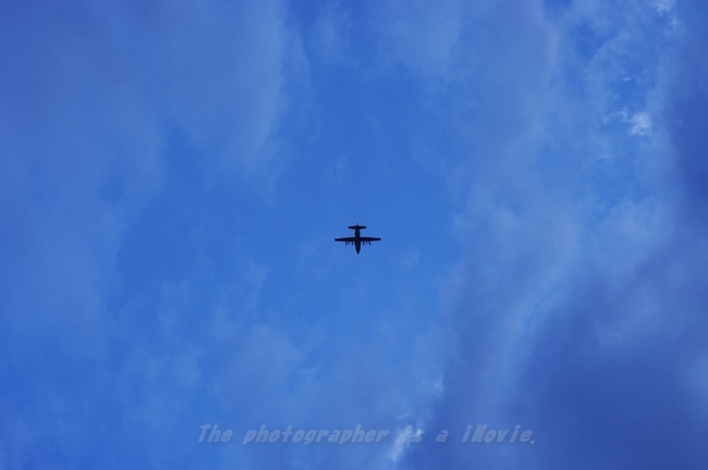 轟音がするので見上げて見ると、輸送機が飛んで行きます。