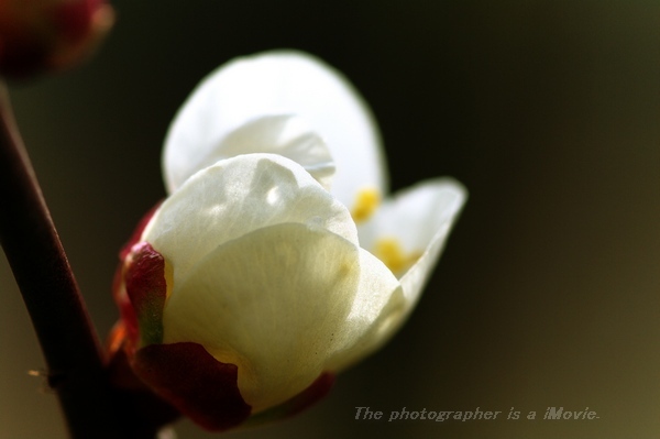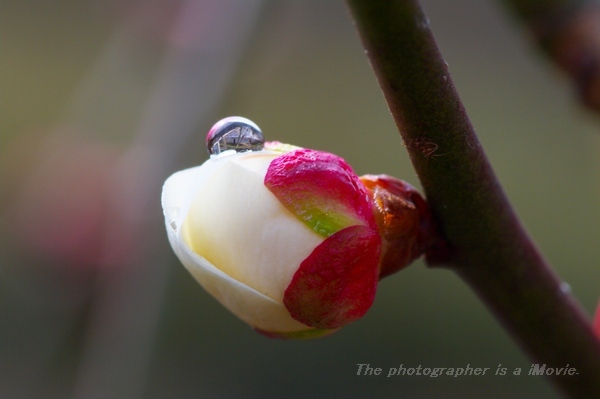 梅のつぼみの上に、ちょこんと水滴が乗っています。