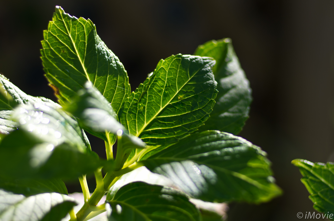 紫陽花の葉にも、同じく陽の光が降り注いでいます。
