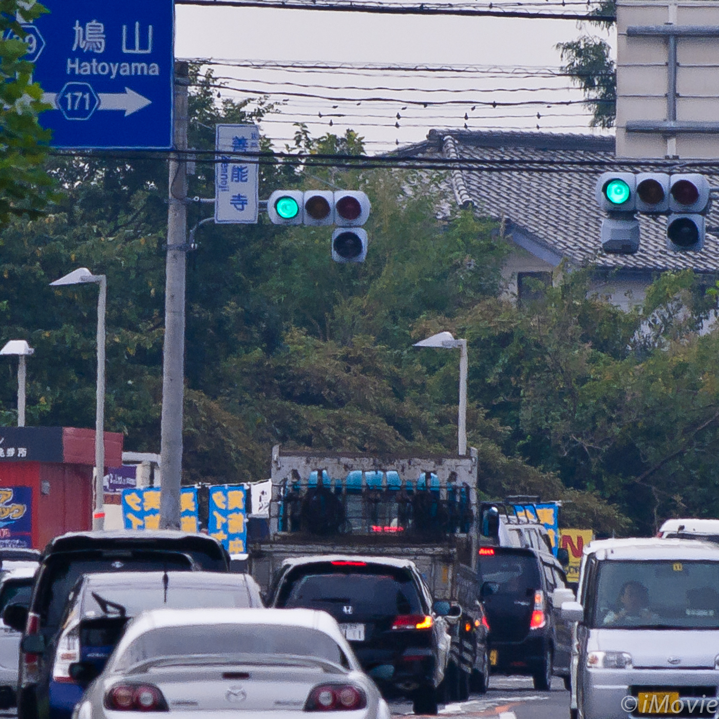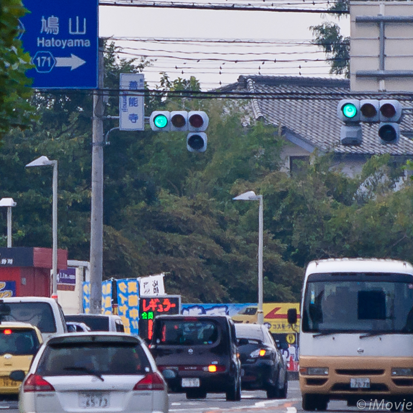 信号機の「善能寺」の標識にAFでピントを合わせています。