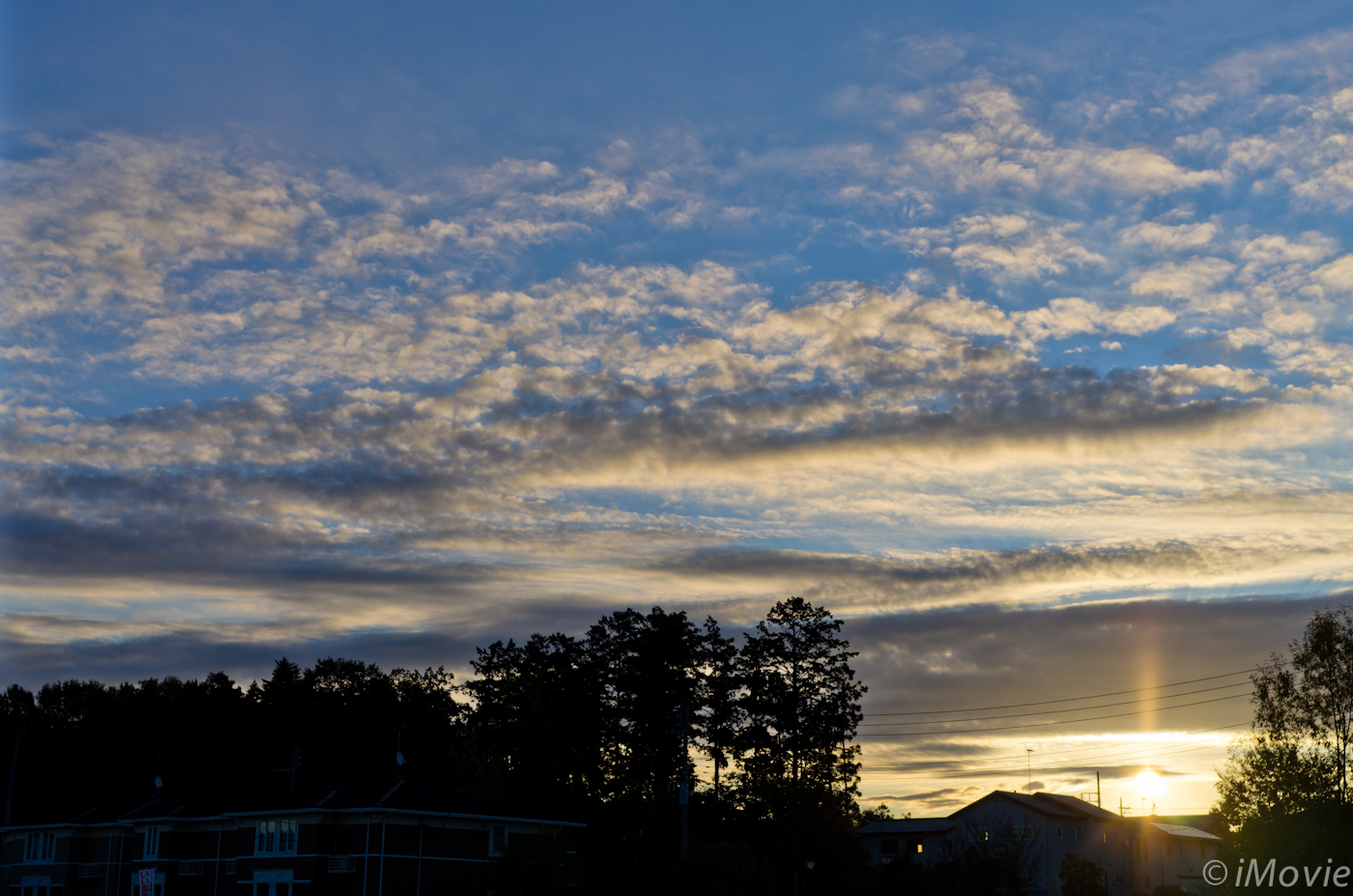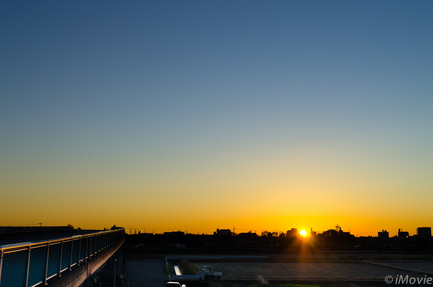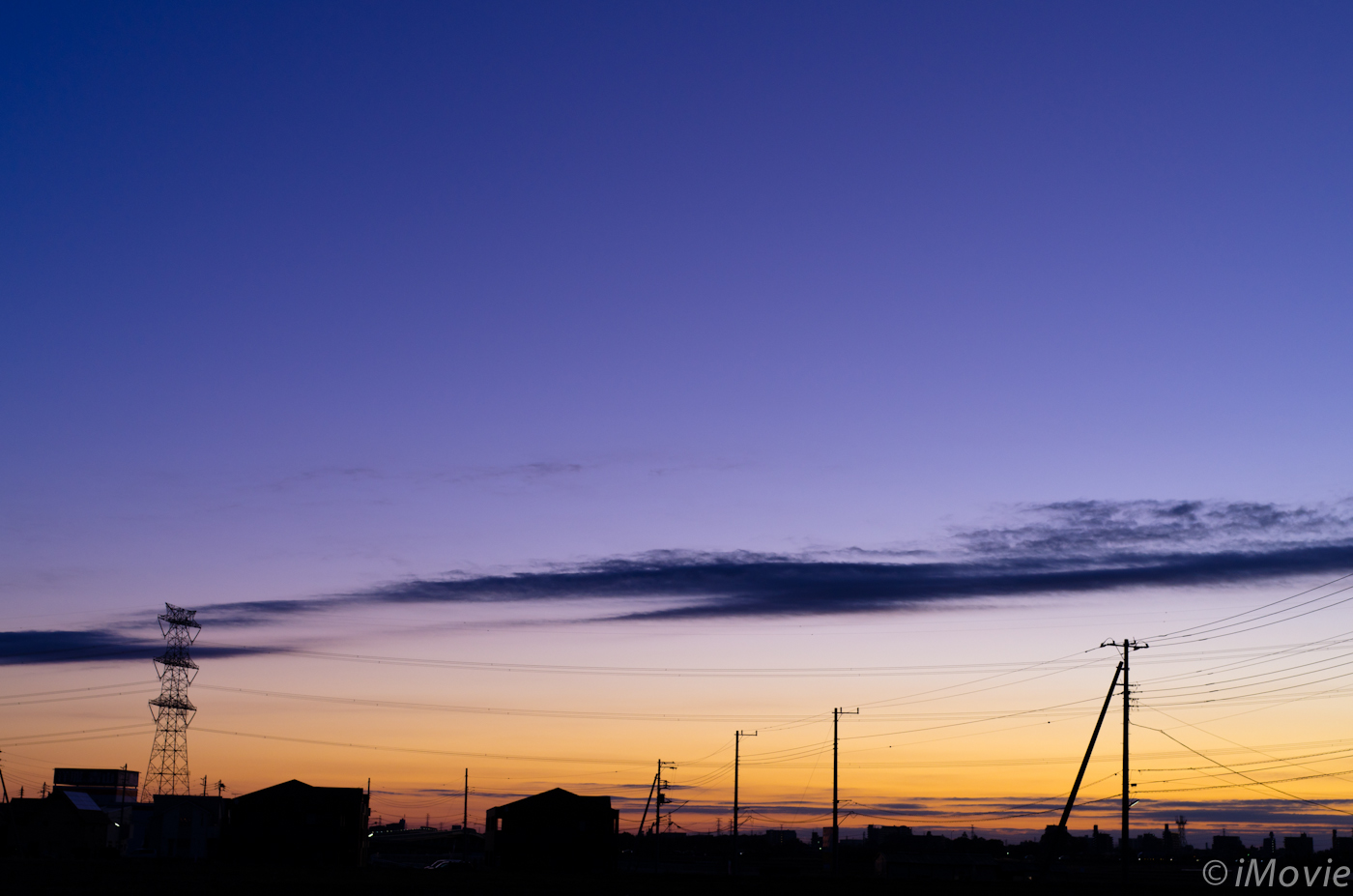 この時間、地平線の近くは淡いオレンジ、低空は淡いパープル、高空は濃いブルーと