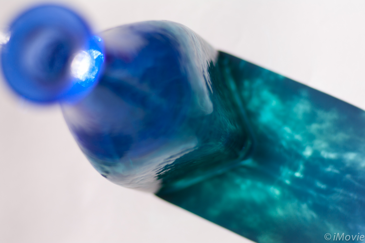 瑠璃色の花瓶があり、窓から差し込む光で輝いています。