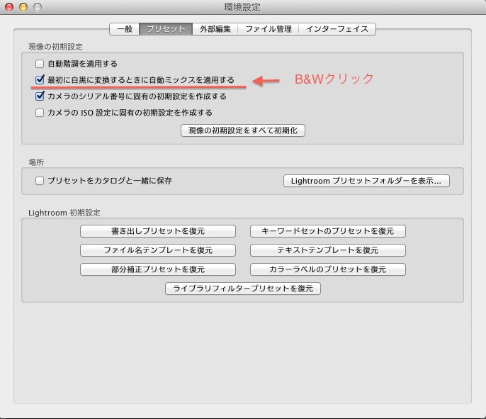 なお、B/W化ですが、Lightroom 3 ユーザーガイドをみていたら、環境設定に