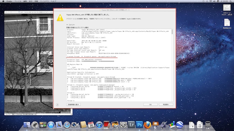 「Topaz BW Effects」のプラグインを使うと、画面のエラーが出て処理が中断して