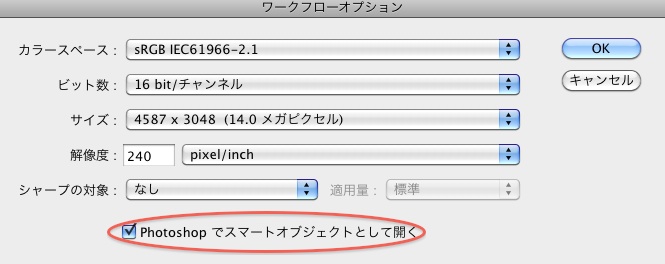 Camera Raw で、「Photoshopでスマートオブジェクトとして開く」チェック